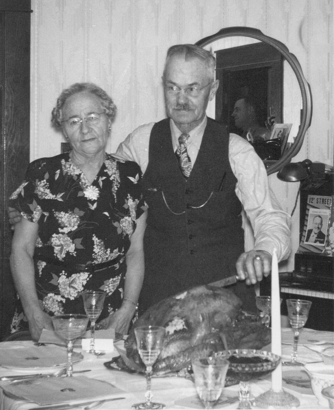 This past year I was given a photo of my great-grandfather Henry Otte and his second wife Mattie. And while I don’t have a definitive date of when this photo was taken, I have deduced from their ages that it was likely taken in the late 1930’s up to 1940. My first thought on seeing this image is that it is a quintessential Rockwellian moment…the family gathered around the plump turkey ready for a celebration. I even wondered to myself as to whether the photographer had been influenced to take this particular shot thinking perhaps he’d recently seen that Rockwell image in the Saturday Evening Post. As it turns out, I had it turned around…it was Norman Rockwell who was inspired by my family…and the hundreds of thousands of similar families… who gathered around their Thanksgiving table, presenting the turkey to their gathered guests.