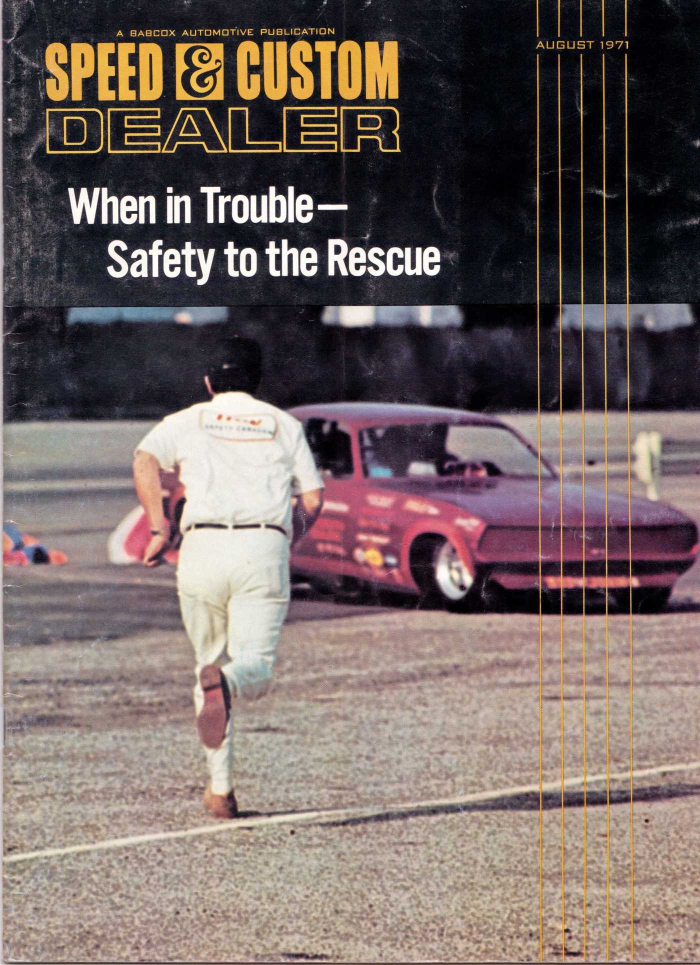 The cover of Speed & Customer Dealer August, 1971- featuring Dick Otte racing towards a drag racer at an NHRA event. The magazine featured an article about Dick and the TRW Safety Caravan