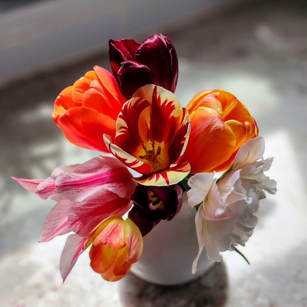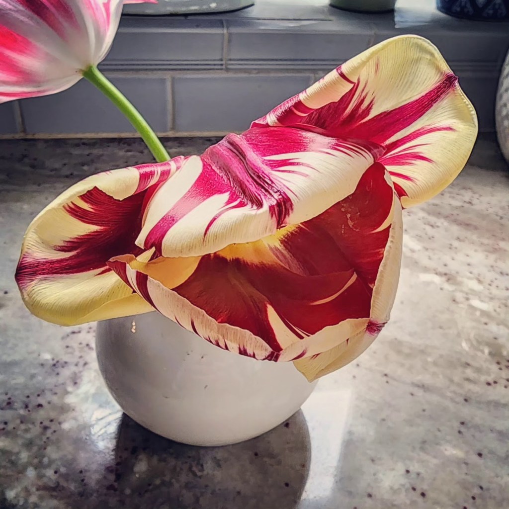 The tulips arrived in the Spring of 2020. We had never planted bulbs in our pots before then. I don’t know how it happened. But my mother, who had been living with us for a few years, decided to plant them in the fall of 2019. It was the gift she planted before she left this earthly plain. And if you knew my mother, you’d know that was her superpower, planting gardens and leaving beauty in her wake. Now I can’t imagine my life without tulips. They are so dramatic in their daily stretches as they open and close and search for the sun’s rays.